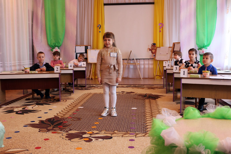 В конкурсе приняли участие четыре мальчика и три девочки - победители внутренних конкурсов юных эрудитов в своих детсадах. Ребятам пришлось преодолеть несколько этапов: узнать по отрывкам текста название сказки, ответить на хитрые вопросы двух скоморохов-помощников, выложить дорожку из геометрических фигур так, чтобы каждая последующая фигура отличалась от предыдущей только одним признаком, соединить картинки так, чтобы название следующего предмета начиналось с последнего звука предыдущего, и другие. Одним из самых сложных заданий было интервью: всего за одну минуту ребенок должен был ответить на 10 и более вопросов корреспондента. Все ребята в целом справились с заданиями.
